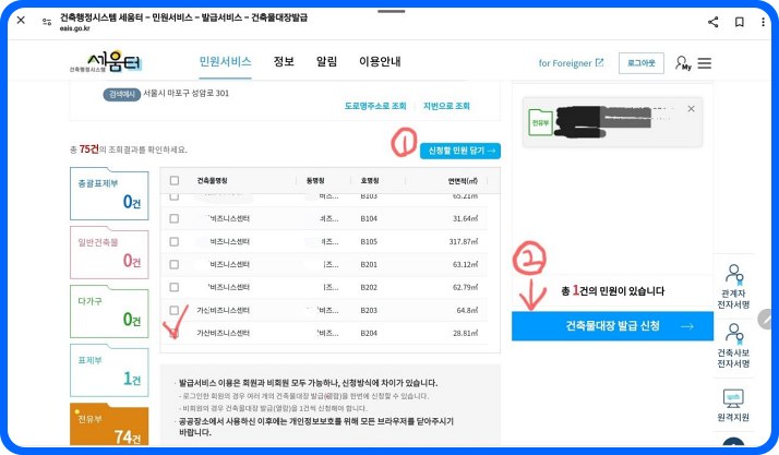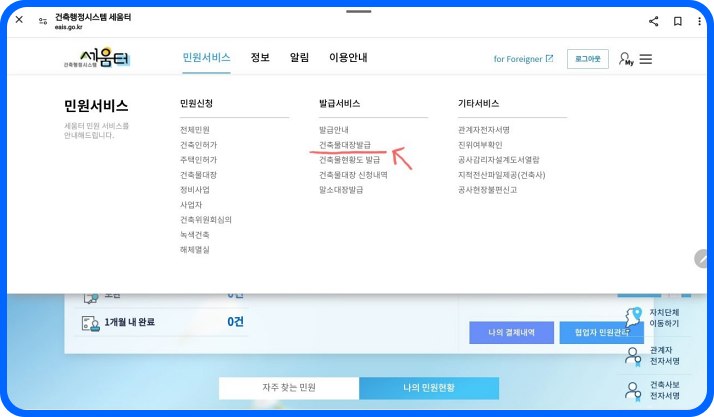 로그인 후 민원서비스 클릭→ 건축물대장발급 클릭을 합니다