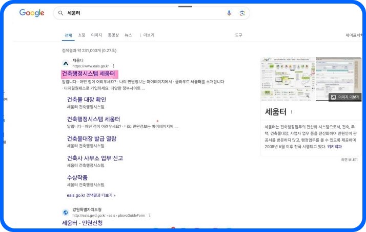 인터넷에 세움터로 검색합니다 → 건축행정시스템 세움터에 클릭합니다