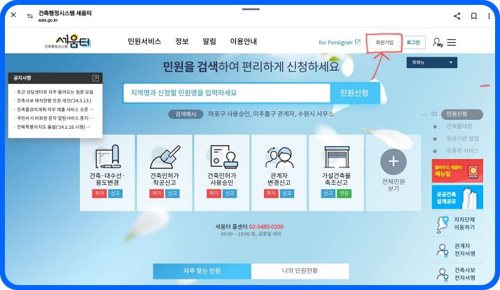 세움터에 클릭하시면 회원가입을 합니다 비회원으로도 발급 가능하지만 가입 후 아이디를 저장해 두고 사용하면 편리합니다→ 로그인을 합니다