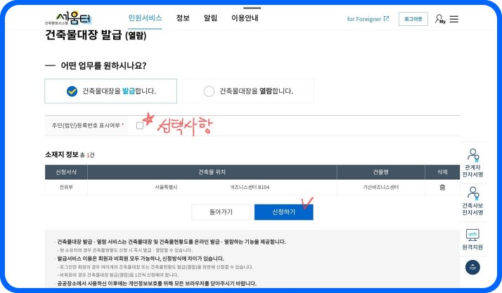 주민(법인) 등록번호 표시여부는 선택사항으로 필요하면 체크하면 되고 신청하기 버튼을 클릭합니다