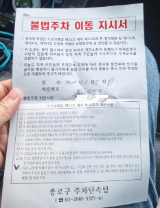 불법주차 이동 지시서... 순간 당황했지만 이게 뭔지 찾아봤죠.. 주차위반 스티커 발행 전 단계인 거 같아요