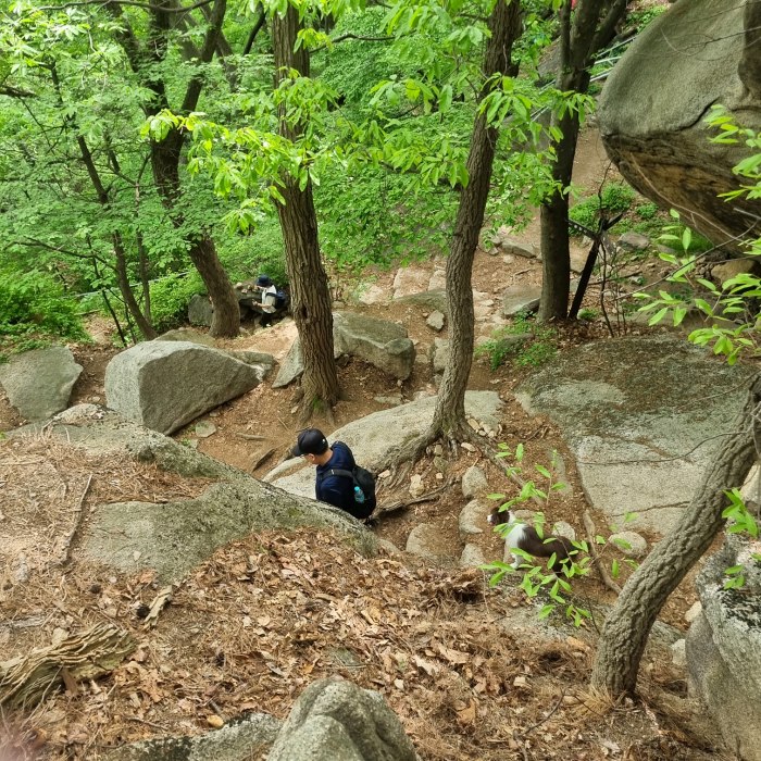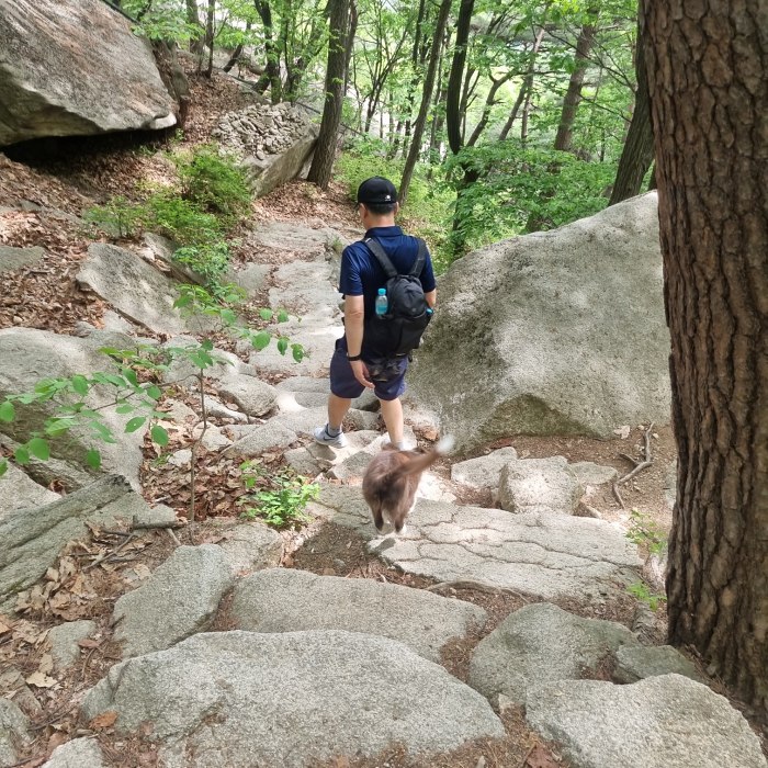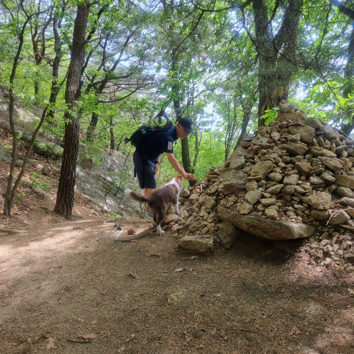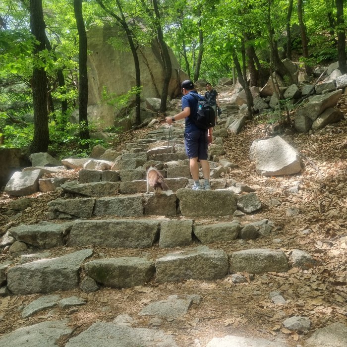 등산 첫 스타드로 올라가는 계단입니다 다른 등산객들을 위해 목줄은 필수로 하고 아무도 없을 때는 목줄을 살짝 놔주기도 했습니다
